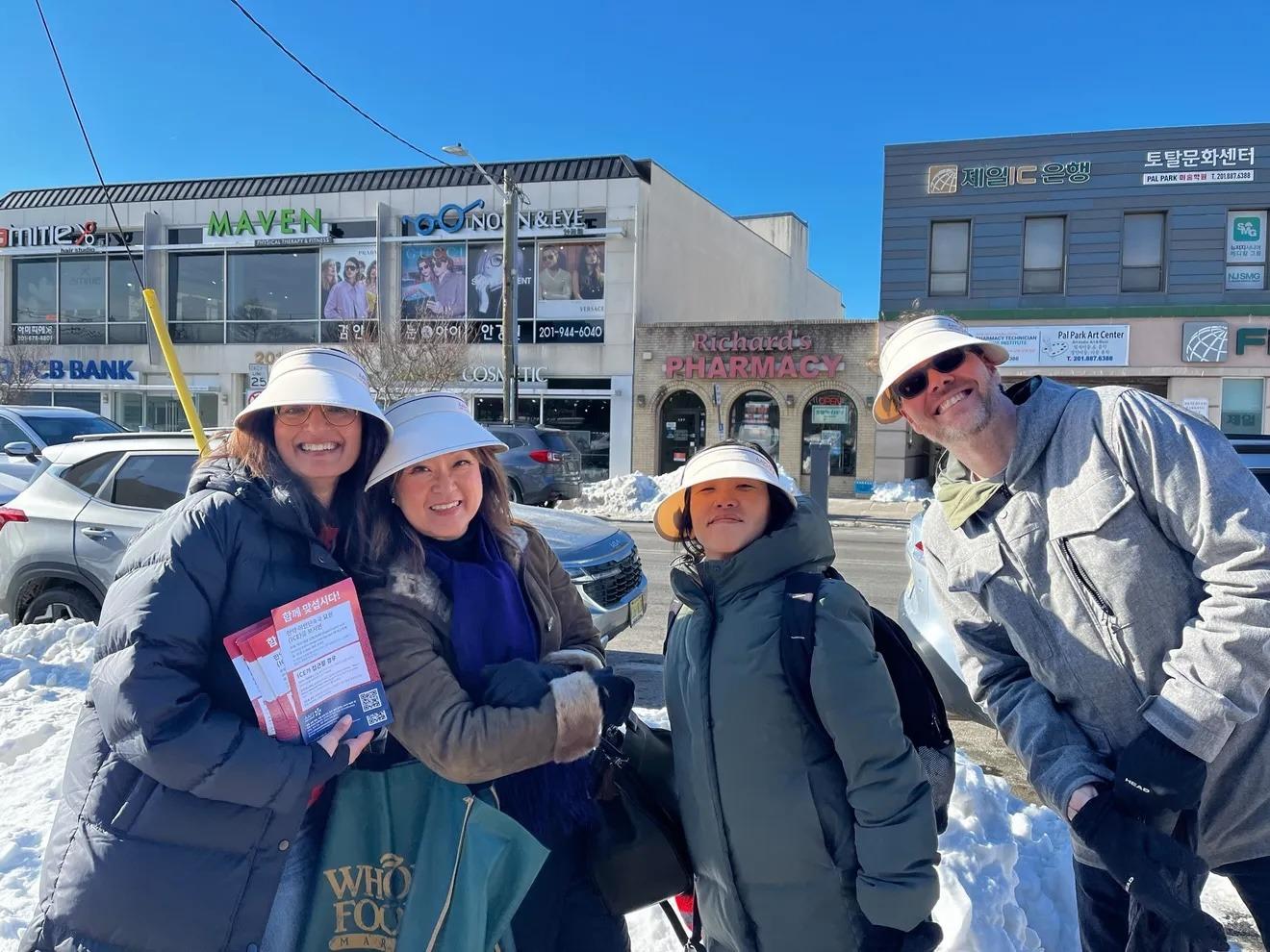 Hyun Ju Kwak y miembros de AAPI-NJ distribuyen volantes de "Conozca sus derechos" a negocios propiedad de inmigrantes en Palisades Park, después de los arrestos de ICE. AAPPI-NJ