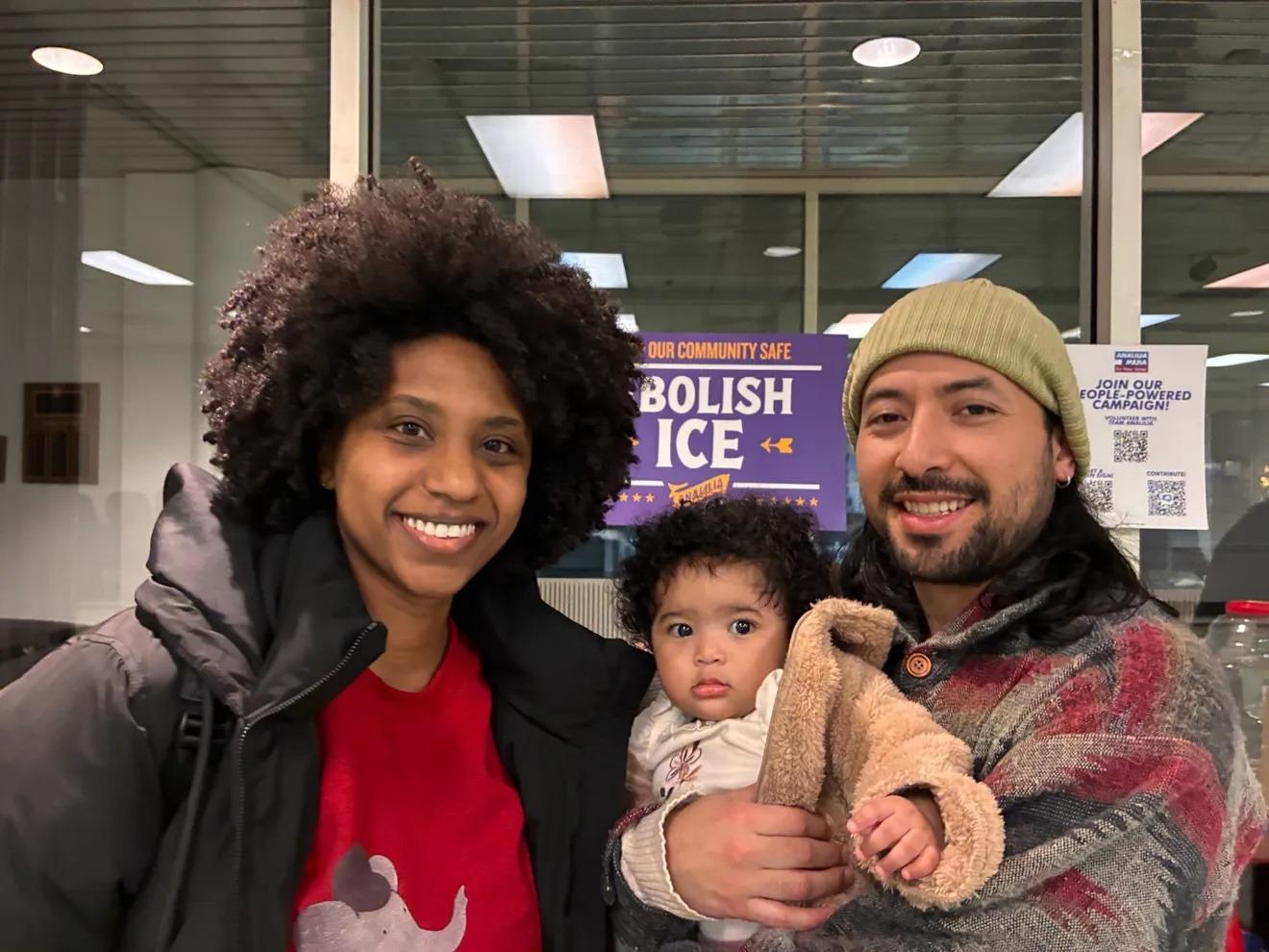 Olivia y Edison Guamba con su hija en Maplewood, asistiendo a una sesión de capacitación para residentes en encuentros con ICE, organizada por la Campaña de Analilia Mejía en el Distrito Congresional 11. Mary Ann Koruth